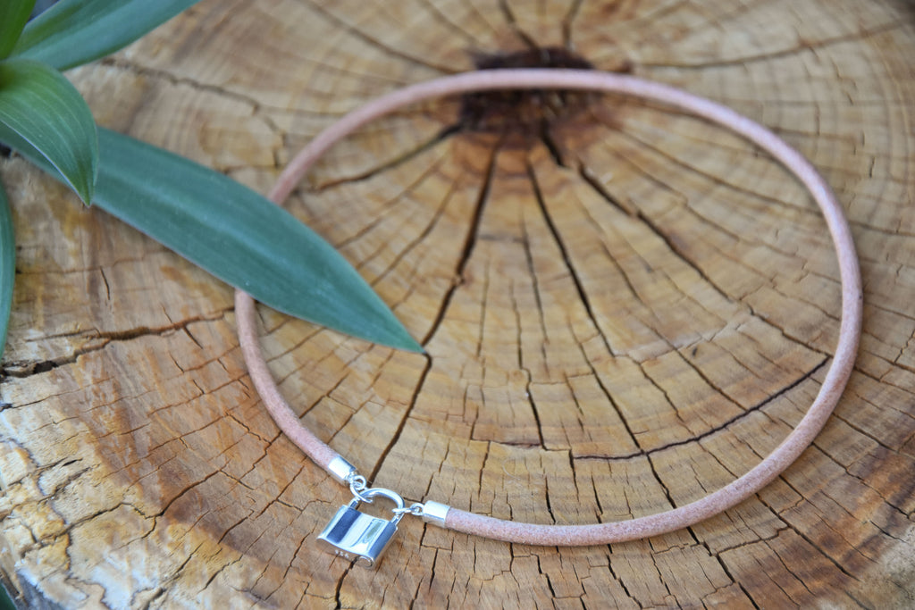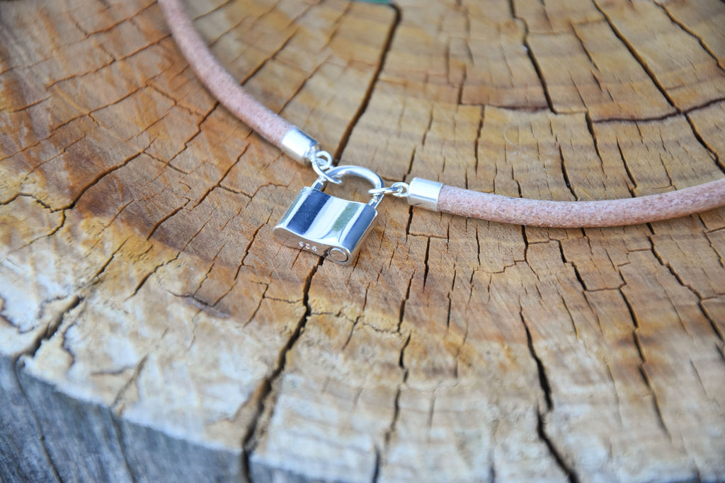 This leather necklace features a beautiful high polished, solid sterling silver padlock. It opens and closes using a spring mechanism.