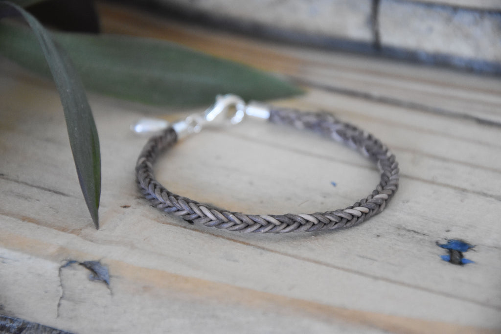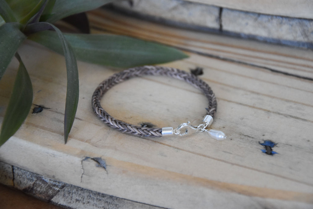 This handcrafted bracelet features genuine leather, tightly braided for strength and a sleek look. The leather is complemented by solid sterling silver ends and a freshwater pearl. Comfortable to wear every day but refined enough for special occasions.