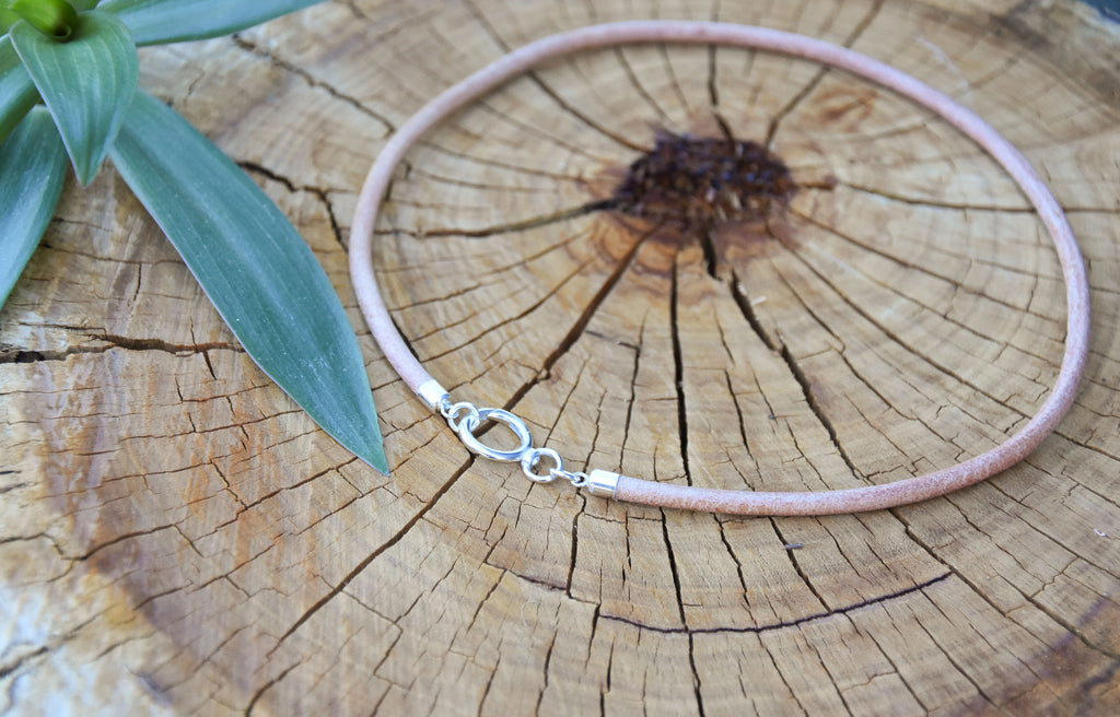 A leather necklace with a sterling silver ring clasp that can be worn on it's own, or you can easily add a pendant for a different look.